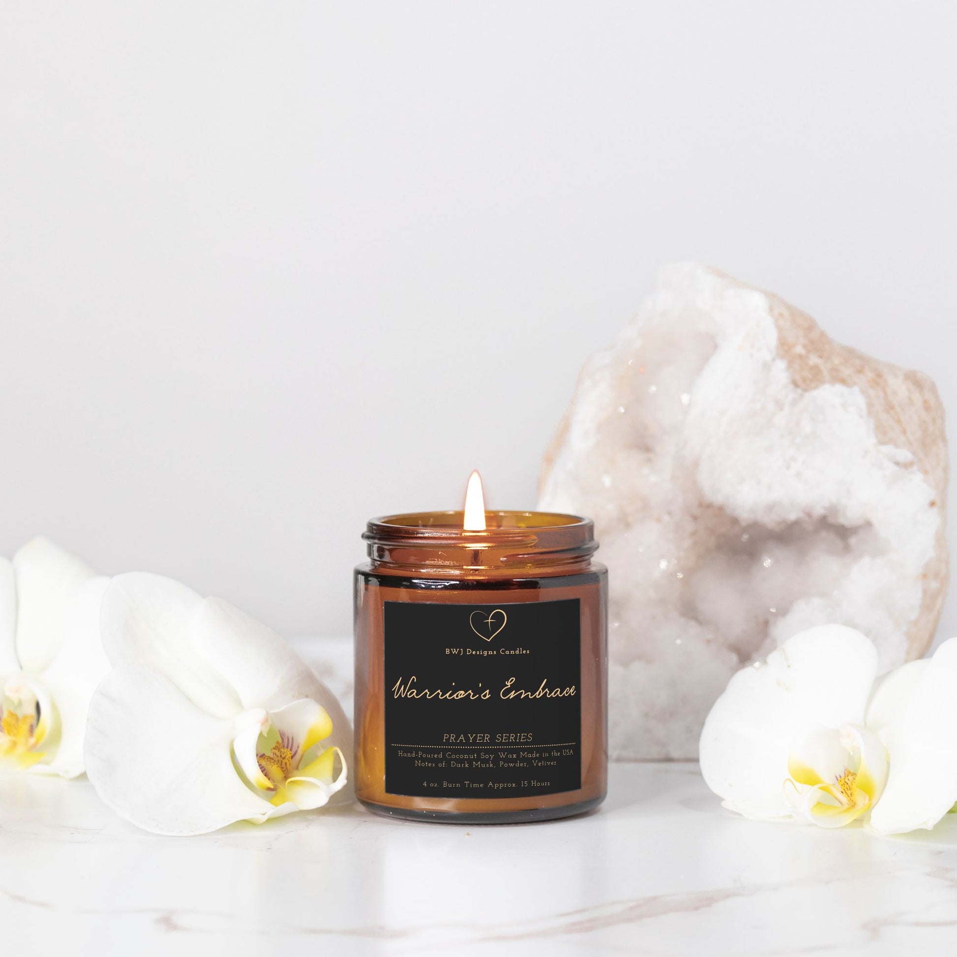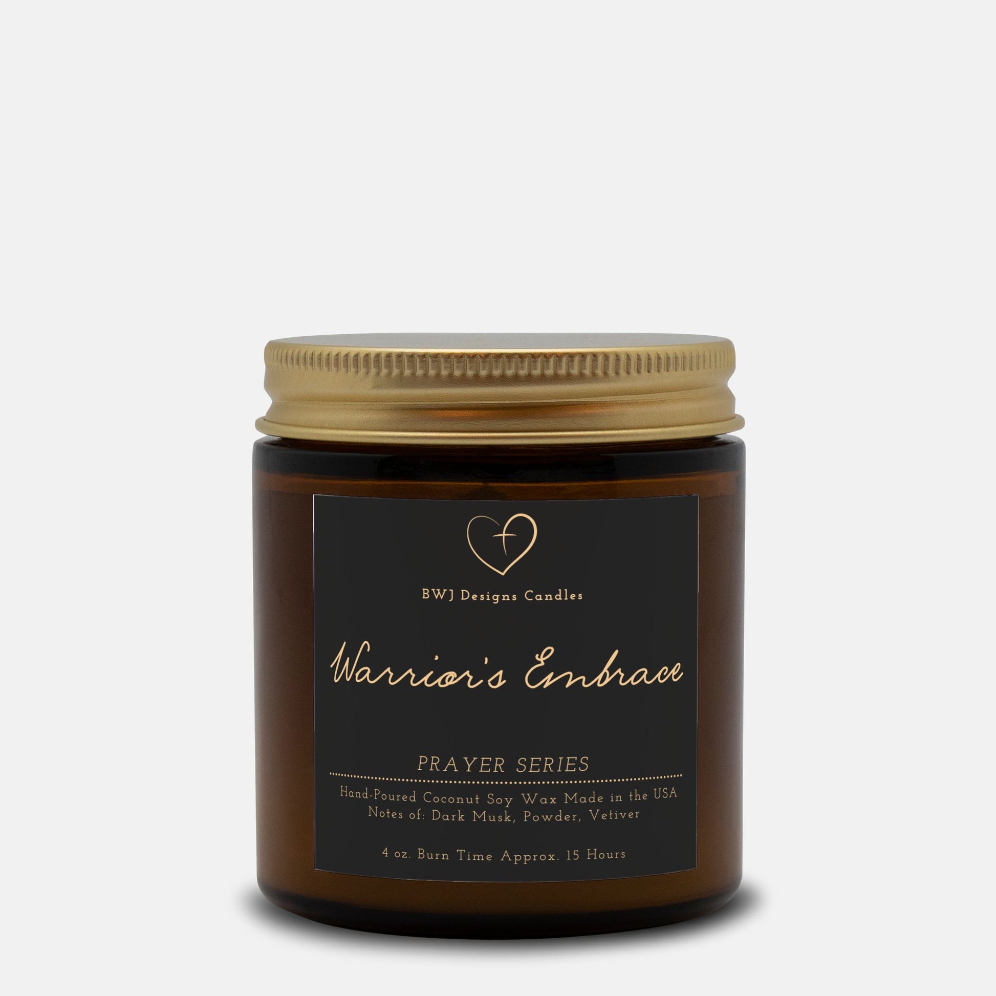 Embark on a spiritual journey with Warrior's Embrace—a luxurious fragrance that weaves strength and serenity into a rich tapestry of scents. As top notes of bergamot and saffron awaken your senses like a call to prayer, the heart unfolds with delicate violet and lily of the valley, embraced by warm amber. Finally, the fragrance grounds you with a soothing blend of dark musk, powder, and vetiver, evoking the unwavering spirit of a prayer warrior. This captivating scent not only whispers divine elegance but also exudes a powerful sense of protected peace and comfort. Experience Warrior's Embrace—an invitation to envelop yourself in empowered tranquility for up to 15 hours of burn time.